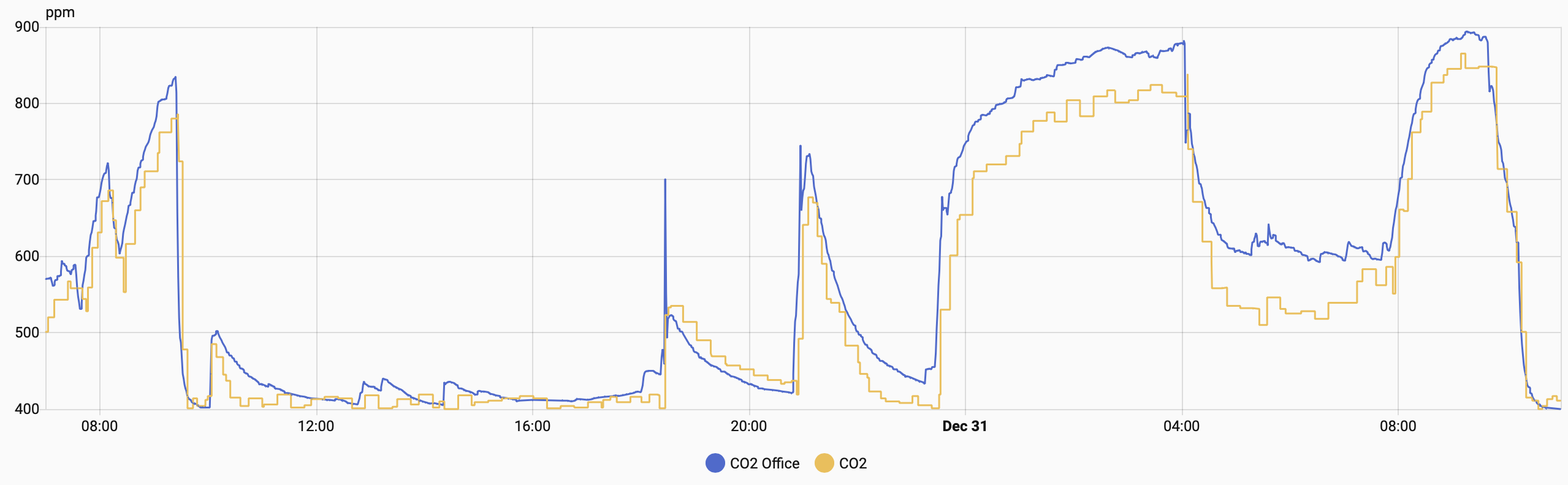 Example measurements in Home Assistant in a bedroom + home office, CO2 office (blue) is the S88, compared to a SwitchBot Meter Pro CO2 (CO2, orange):